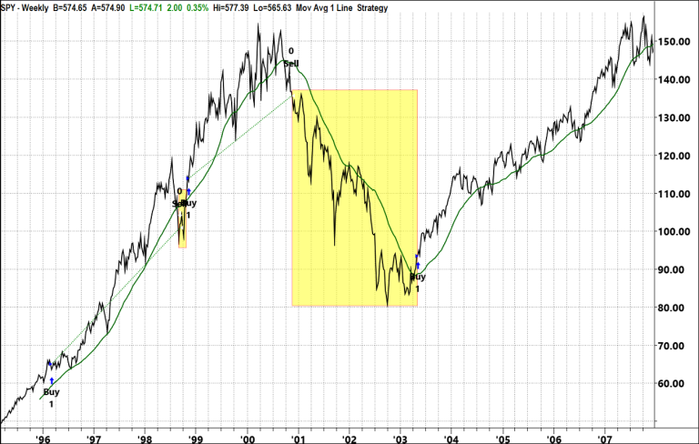 In the article there are a series of charts that show that using the 40-week moving average as a 200-day proxy you can avoid major declines and very volatile markets by exiting when the market is more than 5% below the 40-week average and re-enter when it closes 3% above the 40-week average.