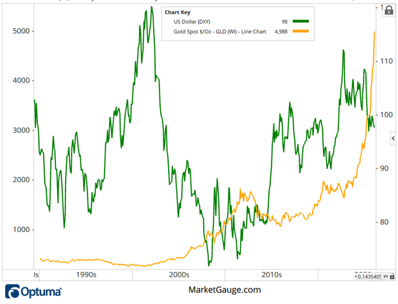 While it's easy to jump to the stereotypical conclusion that gold is going up because the dollar is declining, the long-term perspective shown in the chart below demonstrates that gold is in a bullish trend regardless of what the dollar is doing. The correlation between the two changes dramatically over time.