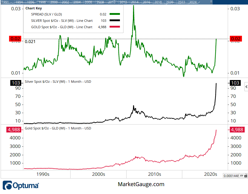 Silver’s move wasn’t only extraordinary on its own; it also pushed its ratio to gold to a level seen in only 3 periods (1998-99, 2006, 2010-11) since 1990.
