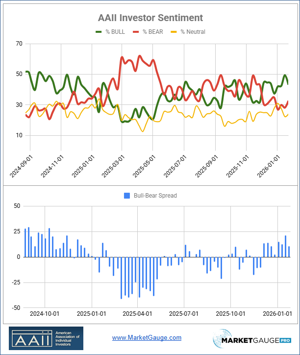 Investor enthusiasm is also running high. The chart of AAII Investor Sentiment below shows that the week before last, the % of Bulls was its highest, while the % of Bears was its lowest, resulting in the spread being the biggest since late 2024.