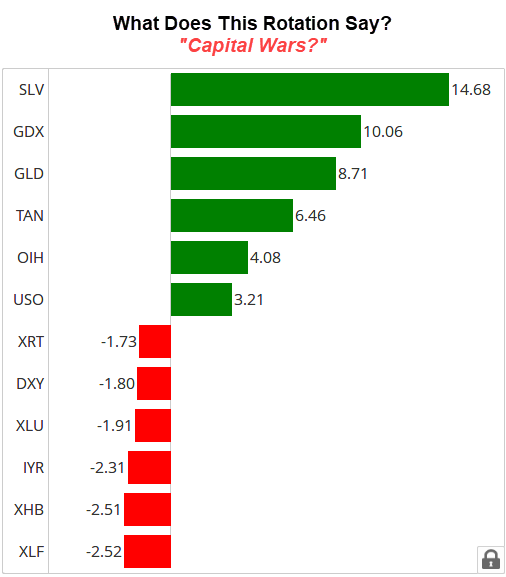 The chart below shows the best and worst performing sectors along with Gold (GLD), Silver (SLV), and the Dollar (DXY).