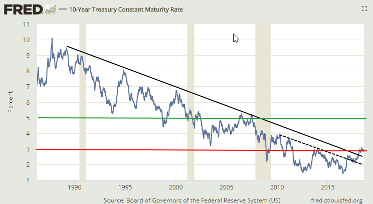 As you can see from the chart below the 10-year is currently trying to break the 3% level (red line) which in 2014 stopped the first rally from its historic lows in 2012.
