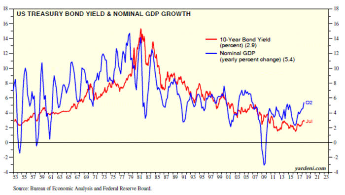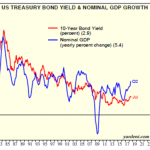 Perhaps he’s reading the work of renown investment strategist Ed Yardeni who recently reported in one of his recent blog.yardini.com posts that, “The Bond Vigilante Model suggests that the 10-year Treasury bond yield tends to trade around the growth rate in nominal GDP on a y/y basis.”