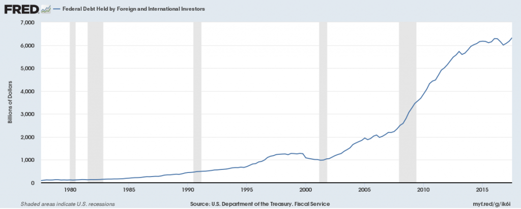 China is holds a trillion or more of our debt, and they’re not the only ‘foreigners’ we depend on to buy our debt as you can see by the chart below.
