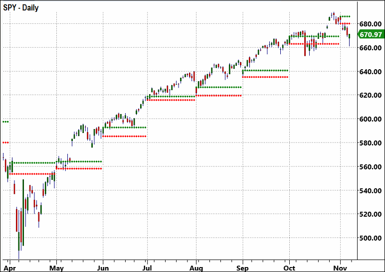 An easy way to see this is shown in the chart below, which has lines that mark the high and low of the first day of the month.