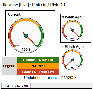 Markets pulled back but stabilized by week’s end, with major indexes rebounding off key moving averages and the overall risk gauge staying fully risk-on as value, transports, and foreign equities regained strength. However, persistent weakness in technology and semiconductors, along with two recent Hindenburg signals and negative market internals, highlight lingering risk-off undertones despite supportive seasonality in November.