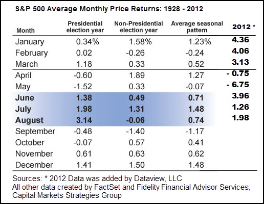 Unfortunately for the bulls, this year is following history’s guide pretty closely. If you look at the last column in the table labeled “2012” and compare it to the first column of “Presidential election year” data, you’ll see that while the magnitude of the moves has been different, the direction of the month has been right on 100% of the time. Also note that this year’s worst performing month, May, is also the worst performing month historically (in an election year).