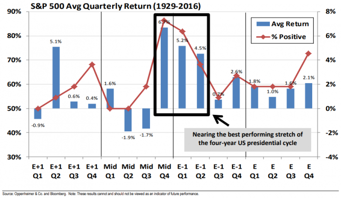 According to Oppenheimer & Co.’s technical analyst, Ari Wald, “Q4 of midterm years through Q2 of pre-election years have been the best nine-month stretch of the four-year U.S. presidential cycle since 1929,”