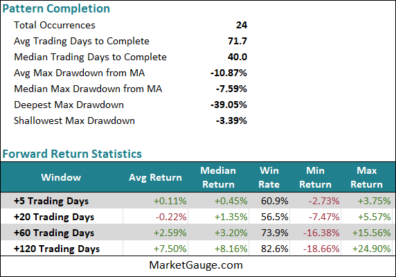 It is certainly prudent to wait for markets to recover the 200-day level if you want to avoid the biggest drawdowns. Below, you’ll find the stats of the last 23 occurrences of this pattern.