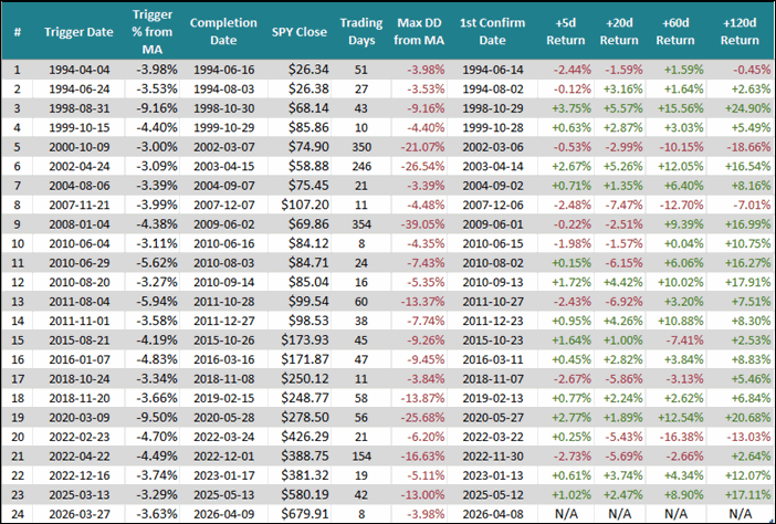 Since the market was able to recently close over 1% higher than the 200-day for 2 days, I looked at what history says about the SPY when it breaks the 200-day by at least 3% and then what happens after it recovers with 2 days of closing 1% above the 200-day.