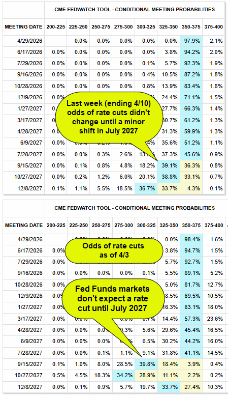 The table below shows the odds data at the end of last week and the week prior. The blue shading shows the rate with the highest probability for the given Fed meeting. The meetings that show any changes are in 2027, and even the odds within the blue boxes did not change meaningfully.