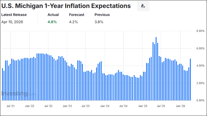 While the markets seem complacent about inflation, the consumer sees it differently. The University of Michigan Survey of Consumers’ expectations for inflation one year in the future reported a value of 4.8% which is much higher than the 4.2% expected and breaks a long downtrend in expectations.