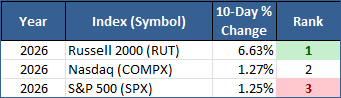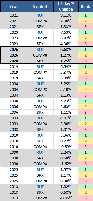 Looking back to 1994, the Russell 2000 has led the year after the first 10 trading days only 33% of the time.