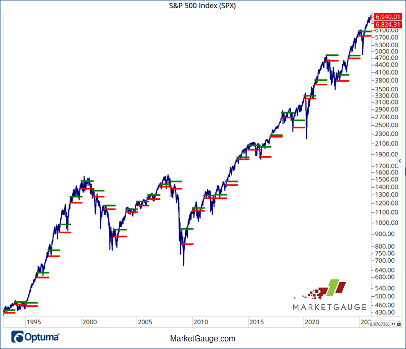 The chart below shows the S&P 500 with the range of the first 10 trading days marked with red and green lines. As you can see, a simple rule of being bullish over the green lines and bearish under the red lines would have served you well.