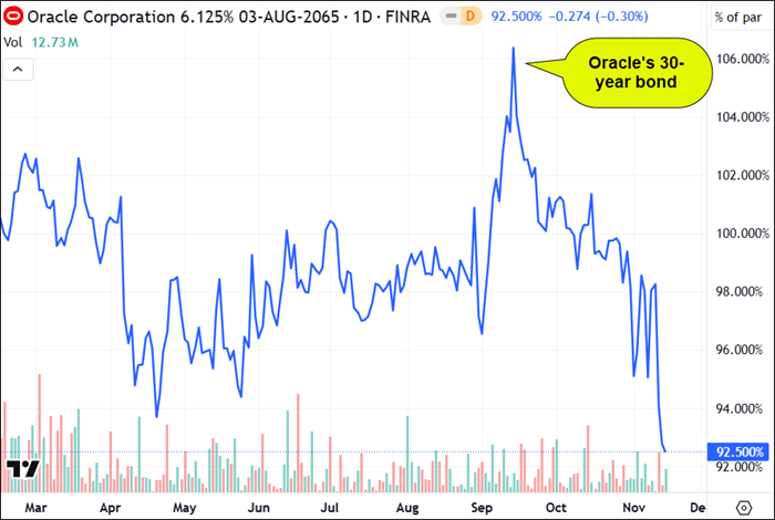 This is more “interesting“ when you consider the chart below. Its 30-year bonds have dropped from 106 at its last earnings report to 92, a new low for the year. The market appears to be questioning whether AI investments are being fueled more by leverage than by profitability.
