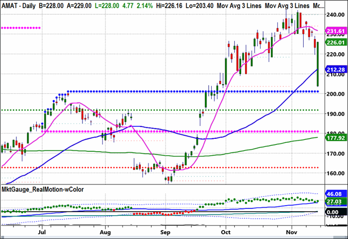 Earnings reflect the mixed signals. Applied Materials reported another quarter of declining sales and flagged continued weakness tied to export restrictions. That said, after opening 10% lower on the news, AMAT rallied immediately and closed higher for the day.