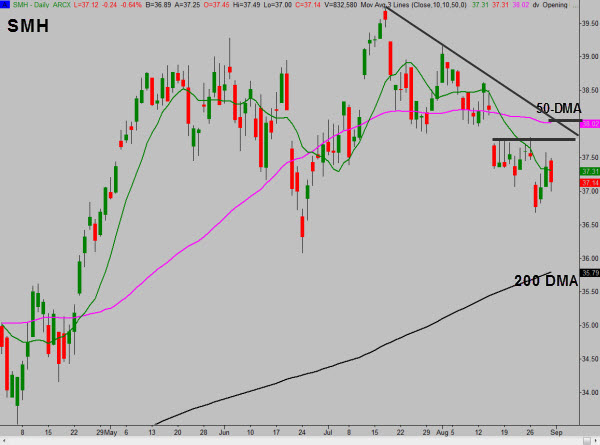 As you can see in chart #1, the SHM has not recovered from its gap down under their 50-DMA. Until the SMH’s break and close over the $37.75 resistance the QQQ’s are likely to remain under pressure. Further confirmation of the end of its correction would include breaking the trendline from the high and trading back over the 50 DMA.
