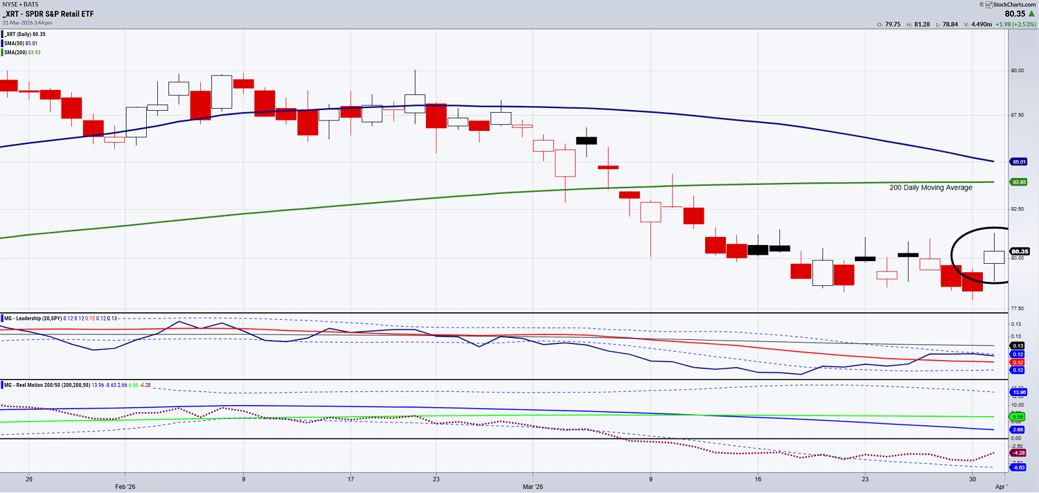 Retail (XRT) Triple bottoms off of June and November 2025, and March 2026 lows?