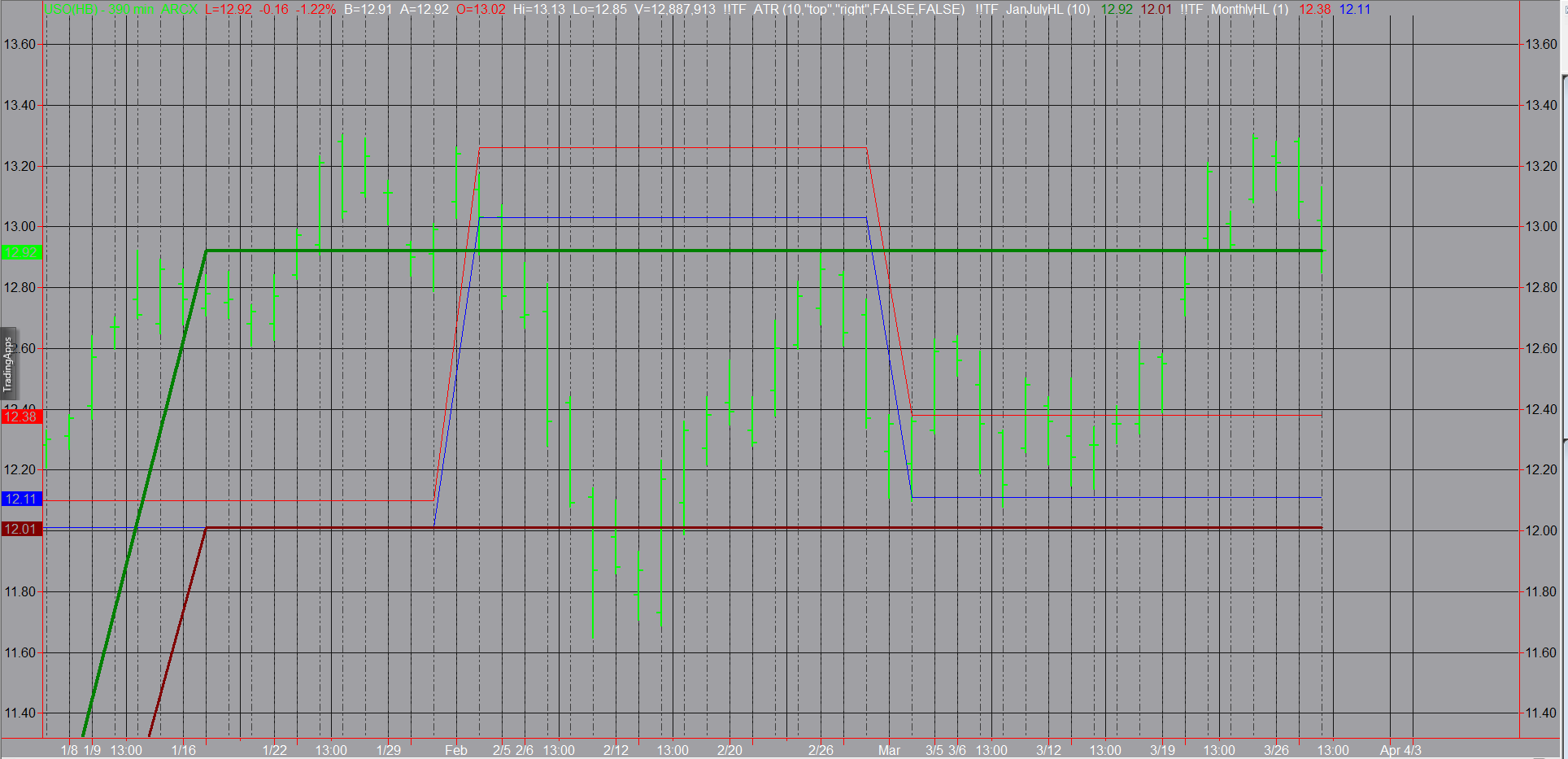 At this point, USO is holding the calendar range high. That price is 12.93.