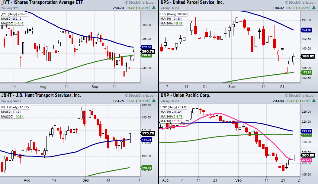 Friday the transportation (IYT) sector made a comeback from this week’s lows along with clearing resistance from its 200-Day moving average (DMA) at $249.46.