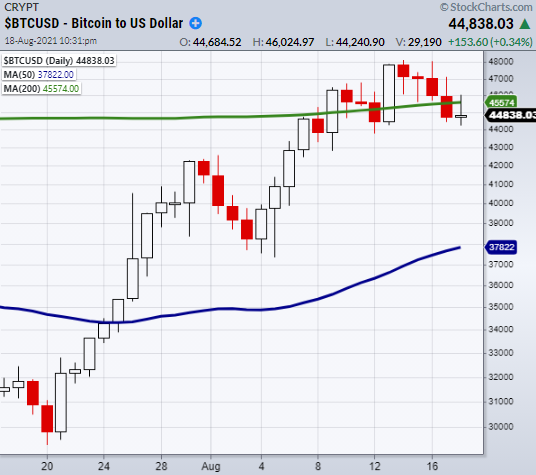 Additionally, Bitcoin is having trouble staying over the 200-DMA at 44k.