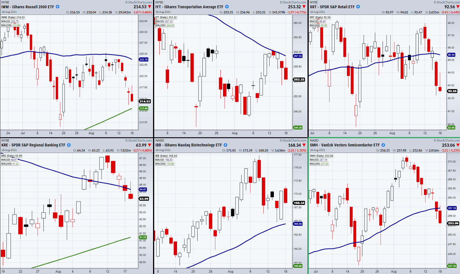 Other members including the small-cap index Russell 2000 (IWM), Transportation (IYT), Retail (XRT), and Regional Banking (KRE) are in the cautionary phase and will need to stay over support from Tuesday’s low in order to stabilize.