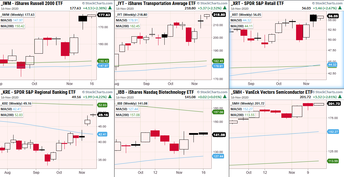 Russell 2000 (IWM) Transportation (IYT) Retail (XRT) and Biotechnology (IBB) are all less than a dollar away from last week's highs.