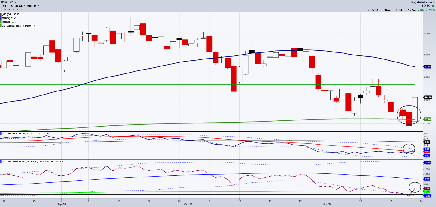 On the Leadership indicator, XRT is outperforming the SPY for the first time since early September.