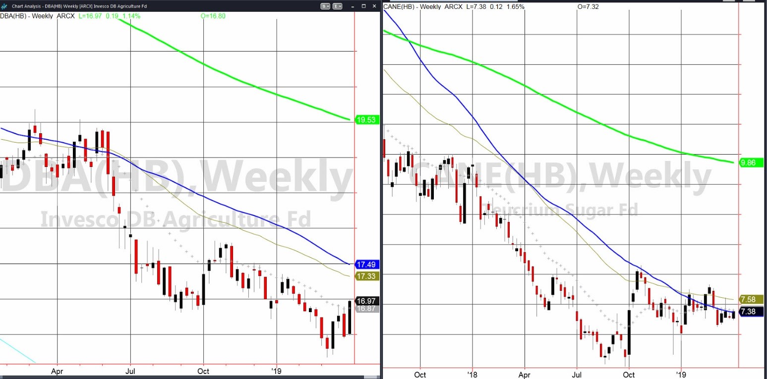 On the left is the weekly chart of DBA, the ETF for Agriculture.