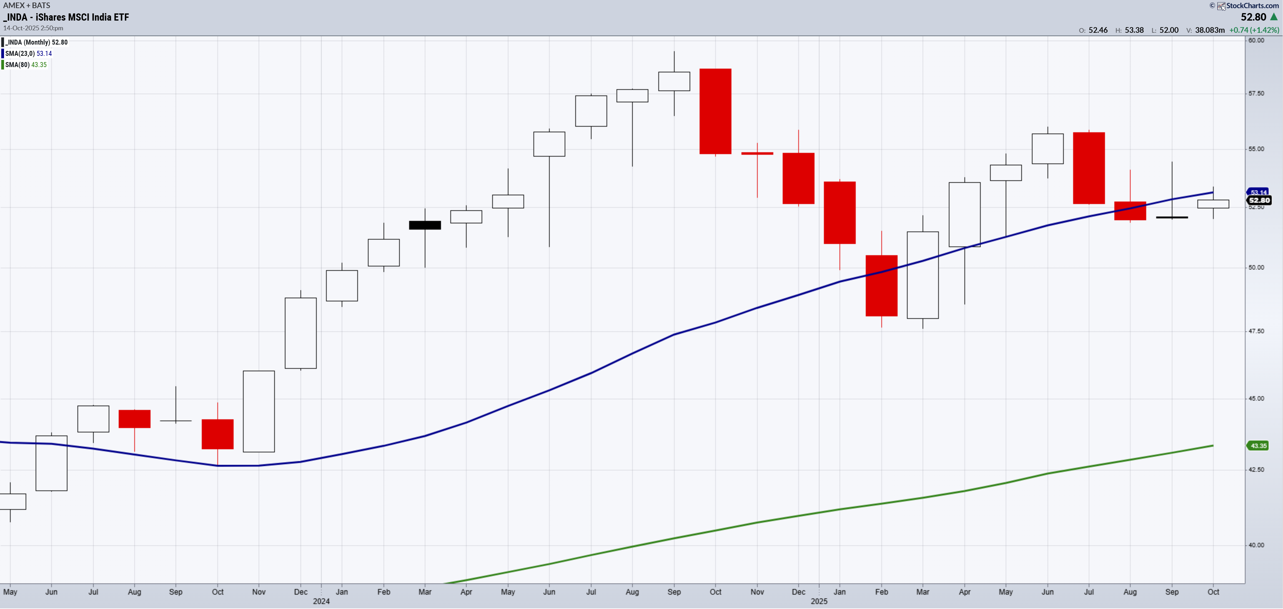 The monthly chart is probably the best for determining a real shift in trend for INDA.