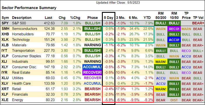 The importance of these stock charts begins with the table shown above. You can find this Sector Summary table updated daily at www.marketgauge.com/sectors.