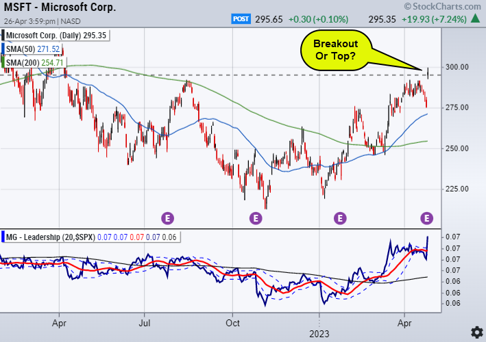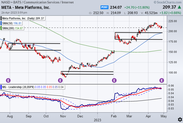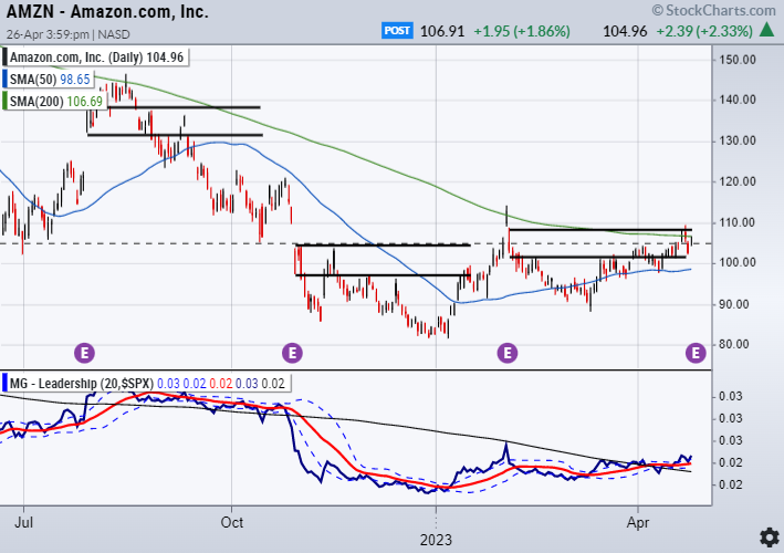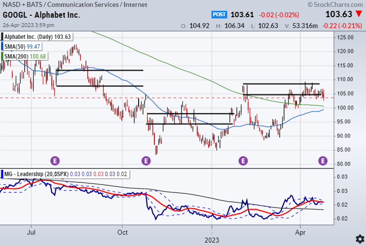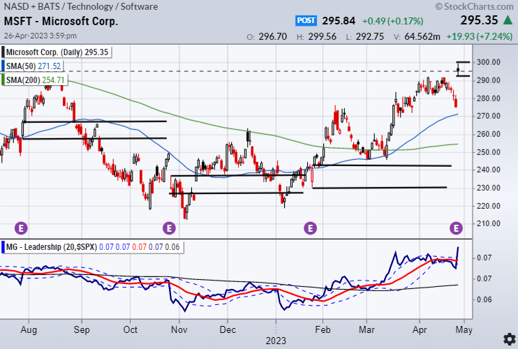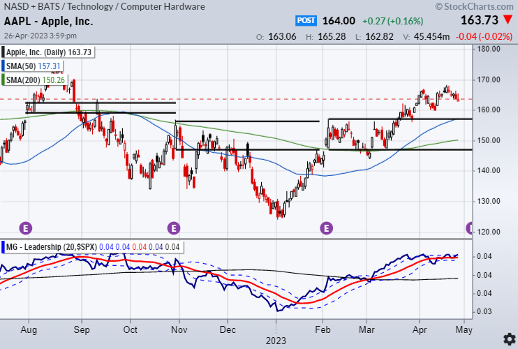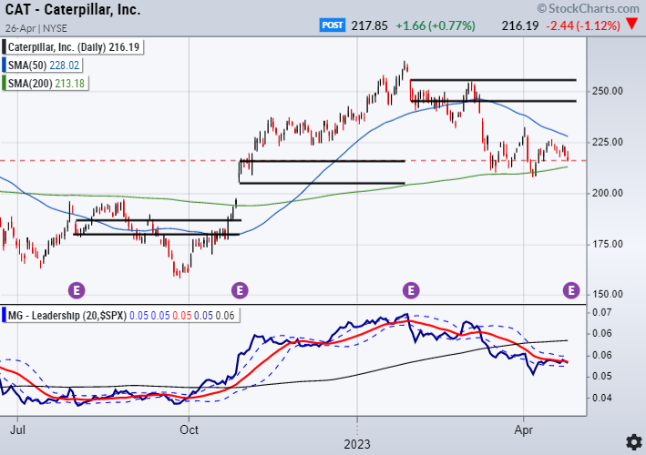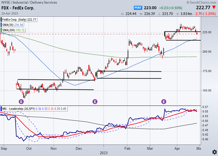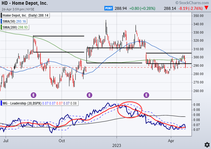 If you look at HD above. You’ll see a red circle identifying the period when HD was trading over its earnings range high, but MG Leadership was bearish. It’s no surprise that the stock didn’t move higher and ultimately fell.
