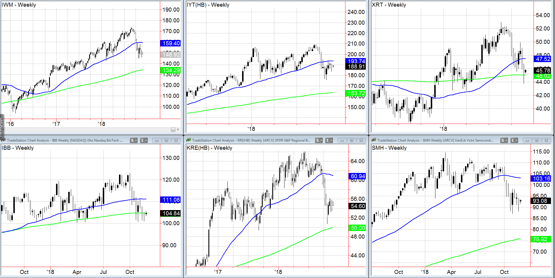 The chart is a weekly timeframe of (top left to right) the Russell 2000 IWM, Transportation IYT, and Retail XRT.