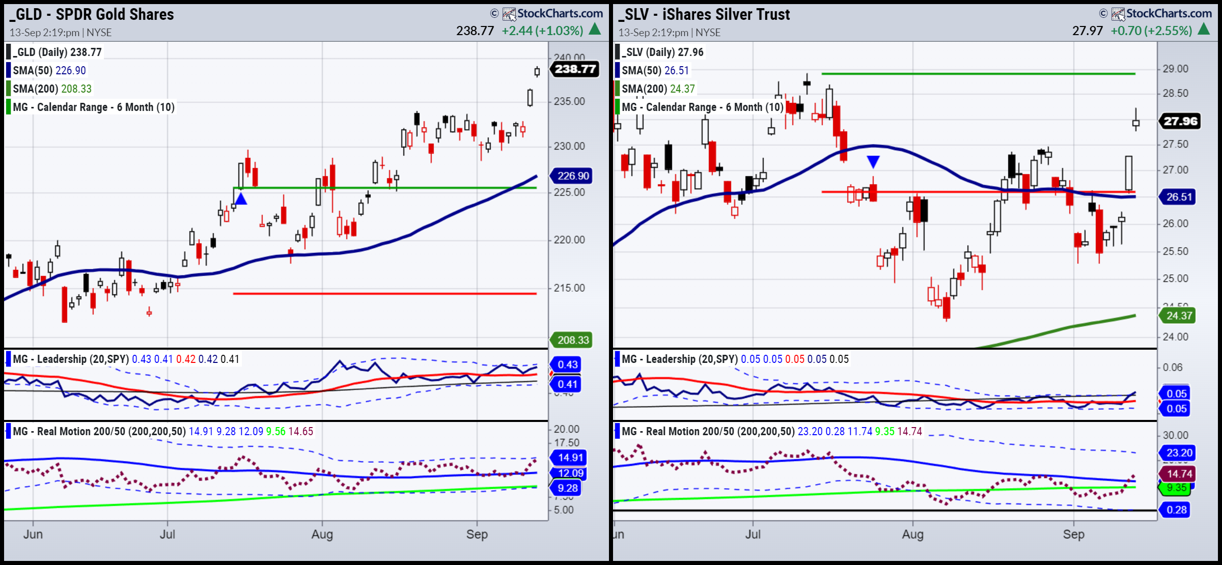 The chart at the top is of the ETFs for gold and silver (GLD and SLV).
