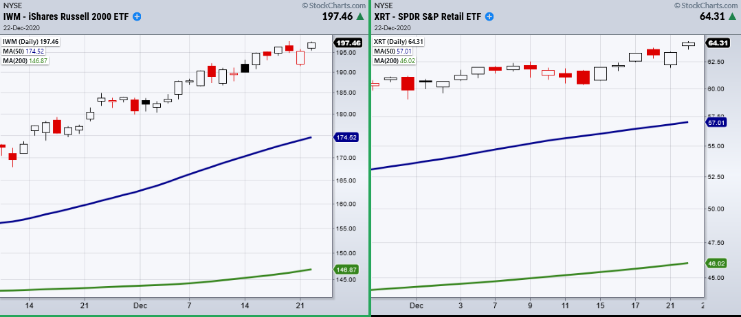 The Biotech sector (IBB) continues with upward momentum with AstraZeneca claiming their vaccine should be effective against the new Covid strain. Furthermore, Pfizer announced a rollout of tens of millions of vaccines coming available.