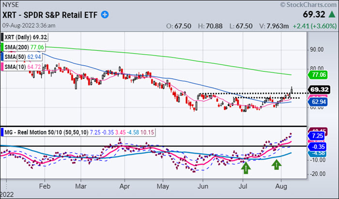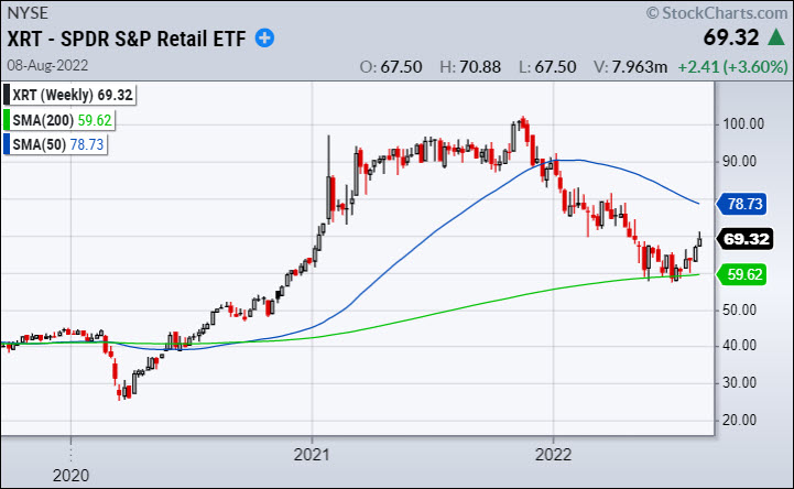 For a longer-term perspective, look at the chart below. You'll see that XRT's base and the breakout is occurring at the 200-week moving average.