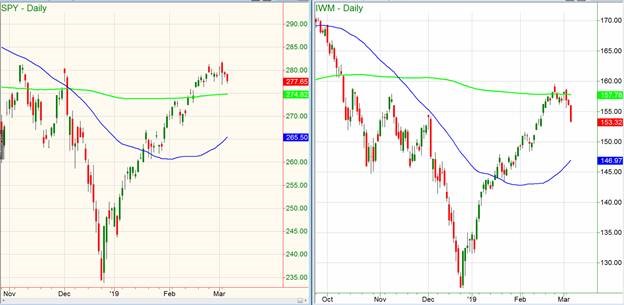 IWM is well below the 200-DMA while SPY is nearly $3.00 above its 200-DMA.