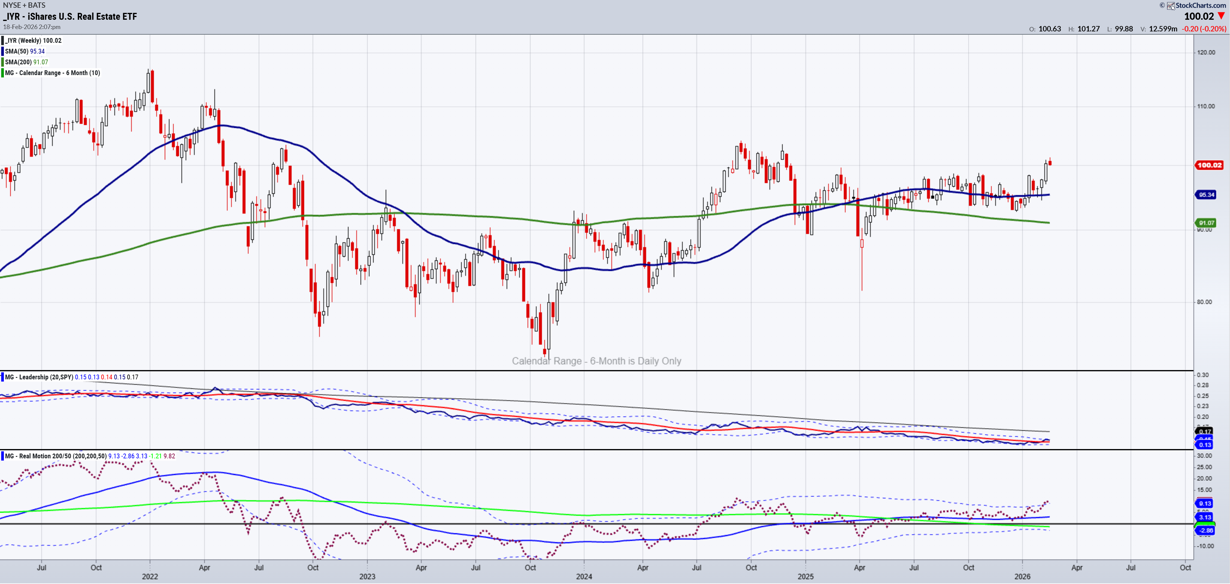 IYR has cleared its 2025 highs and is currently outperforming the S&P 500 as noted by the Leadership chart featured.