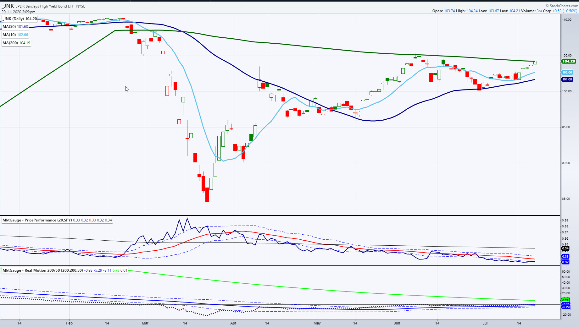 Last week I did a piece on JNK when they appeared more vulnerable, skidding along the 50 daily moving average you see in blue.