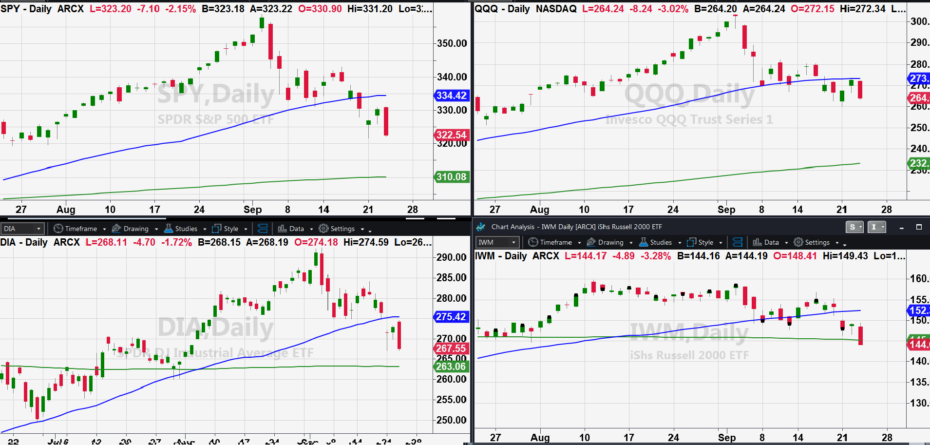 They all sold off today breaking yesterday’s lows. Besides IWM, they are still not below their recent low from September 21st.
