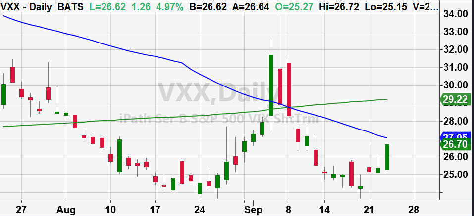 Watching the VXX, which can be used to determine short term fear in the market, that also jumped up today coming close to the high of 26.65 on September 21st.