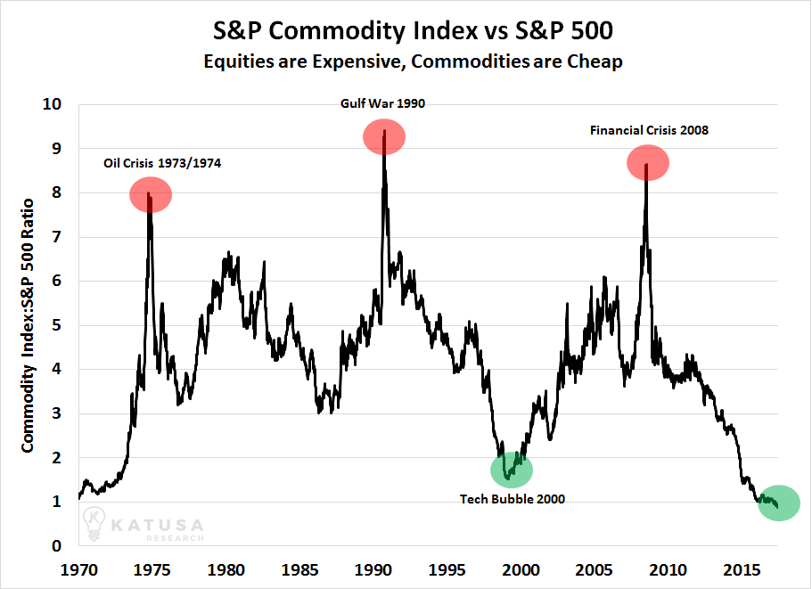 In 2017, commodity prices slumped to a 50-year low compared to US stocks.
