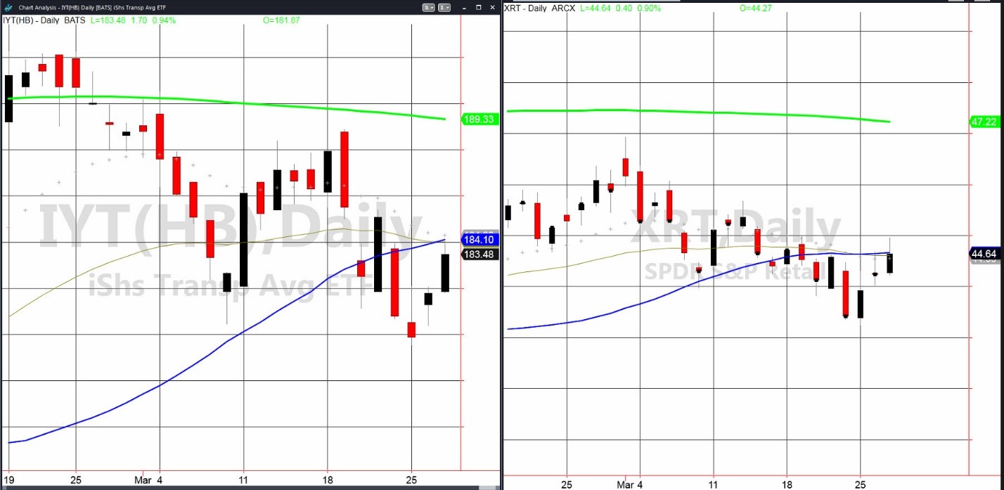 XRT grazed the 50-DMA while IYT closed green, but not green enough.