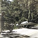 The car stops upside down. The man, hurt, still lives.