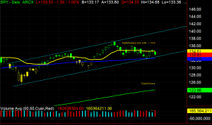 SPY 50 DMA comes in at 132.64-slightly beneath the channel line. One possible scenario is that we hold Friday’s low or go beneath it slightly and see the index rally or at least hover with an inside day. Another is we gap lower and test the 50 DMA and channel line. Remember that often if a channel breaks down and then the price retraces through it-we could get a good entry with low risk. But, I am keeping my sentiment from last week very much alive-until we see an Accumulation Day in volume-market commitment to long side remains short term. But, on the other hand, until I see the chart pattern confirm the weak internals-not committing to the short side either.