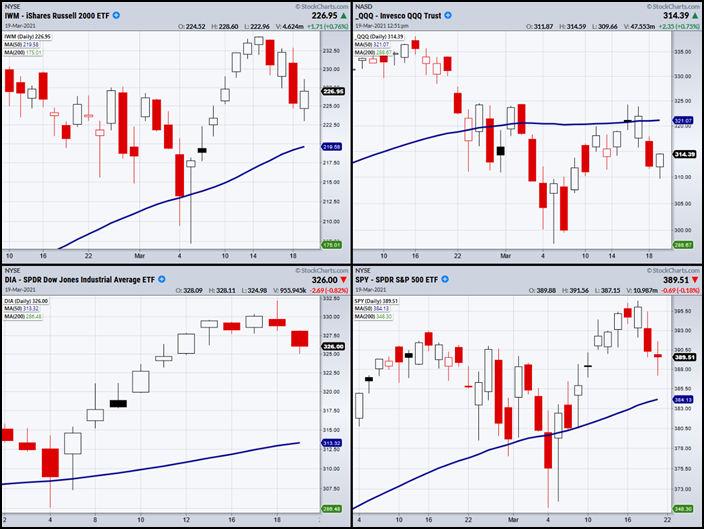 The above daily charts are of the four major indices including the Russell 2000 (IWM), S&P 500 (SPY), Nasdaq 100 (QQQ), and the Dow Jones (DIA).
