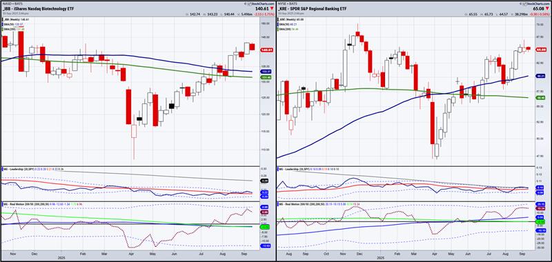 Big Brother Biotechnology IBB and Prodigal Son Regional Banks KRE are also both trading within last week’s range.