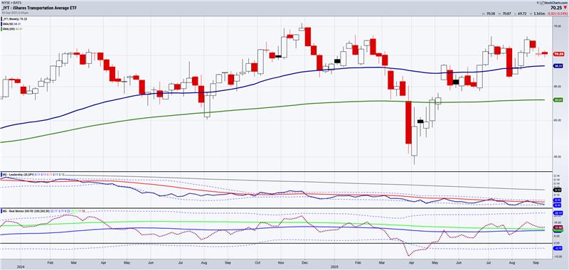 IYT is in a weekly bullish phase, underperforms the benchmark and the momentum is waning but not critical.