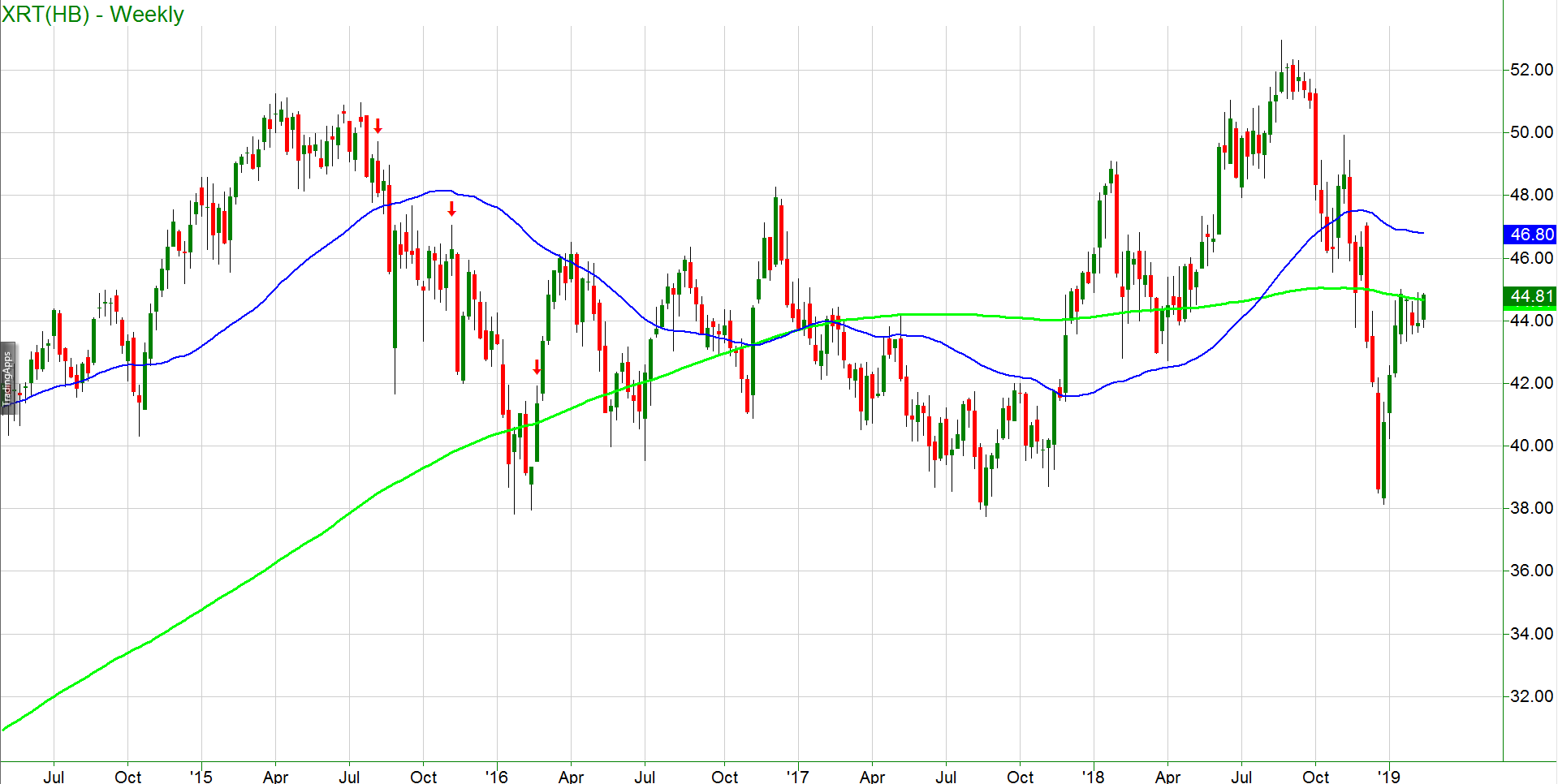 While the rest of the Family (Russell 2000, Biotech, Transports, Regional Banks, and Semiconductors) have been trading over their 200-WMA (week moving average), XRT has not.