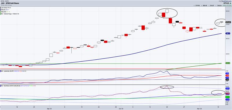 Should GLD begin to decline, performance favor SPY and/or the momentum drop below the 50-DMA (red dots under blue), that could impact the rally.